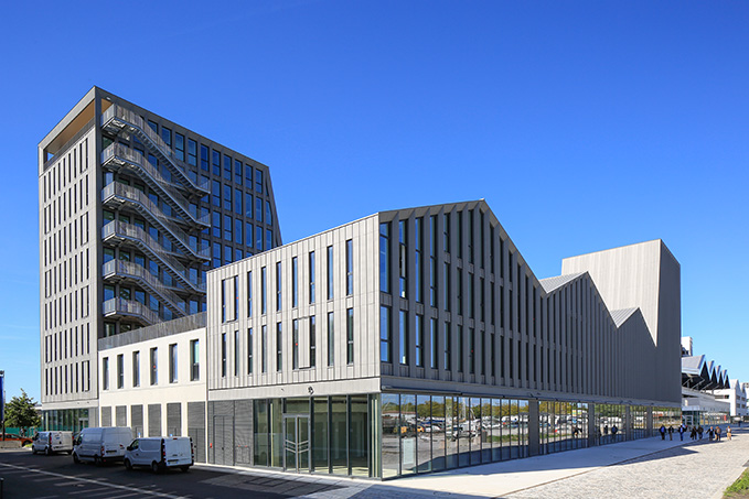 Bürobetrieb am Cap Horn: Das Projekt Cap Horn im Stadtviertel Bacalan in Bordeaux umfasst Büroflächen von rund 8.390 m² und im Erdgeschoss Einzelhandelsflächen von rund 1.500 m². Dächer und Fassaden des Büro- und Geschäftsgebäudes setzen auf eine Außenhülle aus QUARTZ-ZINC und dafür gibt es neben den ästhetischen und funktionalen Eigenschaften von VMZINC noch einen ganz eigenen Grund!