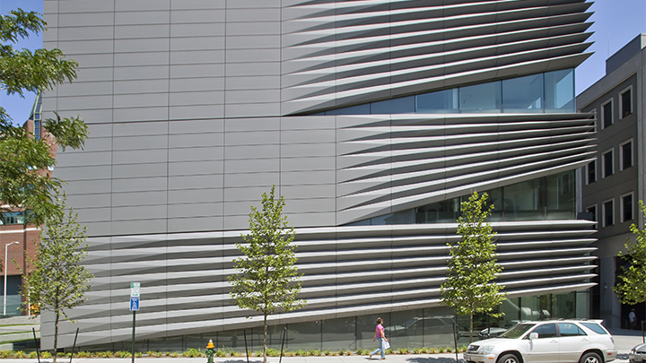 Encourager l’expérimentation et l’enrichissement mutuel entre les disciplines et dépasser les limites entre arts, sciences et sciences humaines », telle est la vocation du Centre d’arts créatifs Granoff (Université Braun). Un bâtiment de 3 600 m² comprenant un auditorium, un studio d’enregistrement, un laboratoire multimédia, une galerie et de grands studios de production multifonctions. Original, le concept prévoit trois dalles de plancher empilées, coupées en deux et décalées verticalement pour créer six demi-niveaux séparés par une paroi de refend en verre. Ce décalage fait communiquer chaque studio avec ceux situés au-dessus et en dessous, tout en contrôlant la lumière, les sons et la visibilité. Un escalier intérieur relie tous les étages et ses paliers s’élargissent en espaces de pause meublés. Cette stratégie des niveaux partagés est également appliquée en extérieur : le paysage devant le bâtiment est scindé en deux – une moitié en pente depuis le hall d’entrée et la galerie publique, l’autre inclinée vers un amphithéâtre extérieur donnant sur un auditorium.