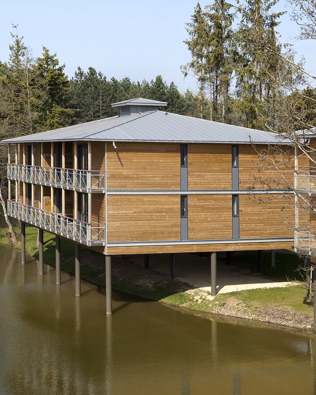 Les matériaux utilisés (béton, parement de bois, zinc) ont été choisis parce qu’ils ne nécessitent peu ou pas d’entretien. Le zinc a été préféré à l’ardoise, matériau régional, car il permet d’obtenir une pente plus faible et peut être recyclé, dans l’hypothèse de la destruction du complexe. Ce qui en revanche n’est pas classique, ce sont les pilotis sur lesquels sont perchés les logements. Ils n’évoquent pas l’architecture lacustre par hasard : le parc est en zone inondable, et si en 2004 le plan d’urbanisme y autorisait encore les constructions, l’architecte s’était lui-même fixé un certain nombre de règles permettant d’adapter les édifi ces à cette contrainte. Les bâtiments doivent faciliter le libre écoulement des eaux, assurer la salubrité des biens et des personnes, respecter la faune et la flore et enfi n faire l’articulation entre l’architecture et le paysage. Ce dernier objectif, plus difficile à