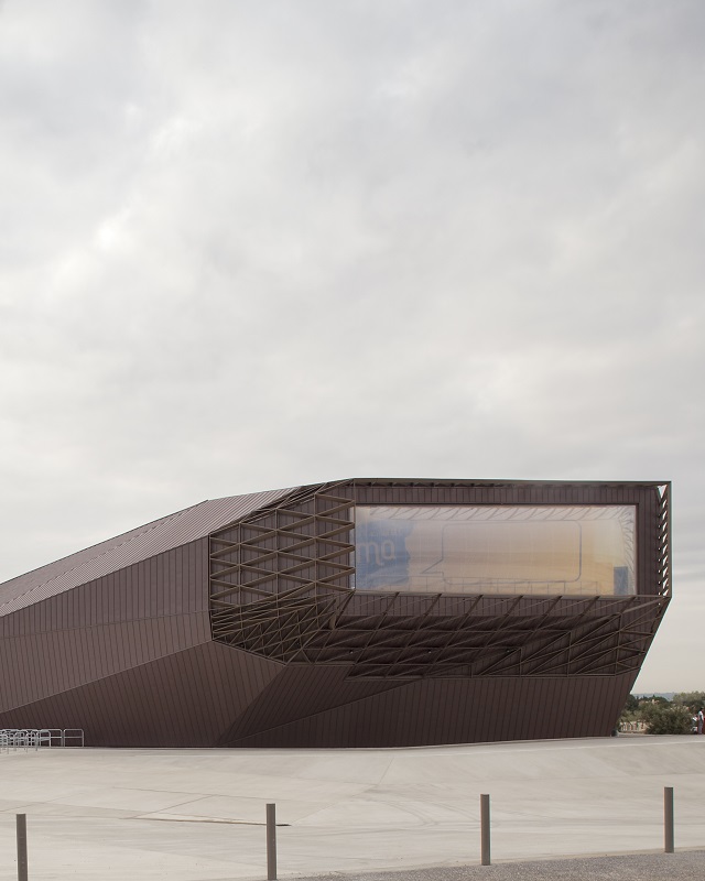 Celle de Nîmes ne fait pas exception à la règle. Paloma - tel est le nom de baptême de l’équipement - déploie la plastique de ses formes en bordure des pistes de l’aérodrome. Le parti-pris du bâtiment-sculpture répond au contexte suburbain et au programme. L’emboîtement de prismes semblant rentrer en collision exprime la vitalité et l’énergie créatrice émanant du lieu. Il génère un porte-à-faux pouvant abriter le public faisant la queue à la billetterie, et introduit des dissymétries masquant les espaces réservés aux professionnels - entrée des artistes, déchargement du matériel, etc.